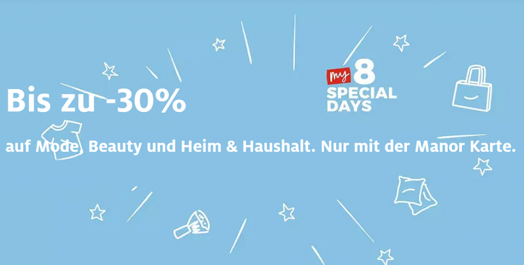 Bei Manor findet derzeit die 8 Special Days Promotion statt! Bei dieser profitiert ihr ab heute bis zum 28.03. (was eigentlich einer Woche entspricht? Wieso heisst es dann 8 Special Days?!?!) von 30% Rabatt auf viele Kategorien, sofern ihr die kostenlose Manor-Karte bei der Kasse angebt. Diese ist schnell erstellt, den Link dazu findet ihr hier.