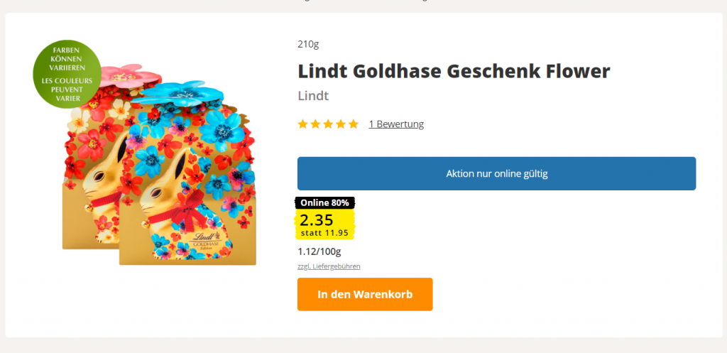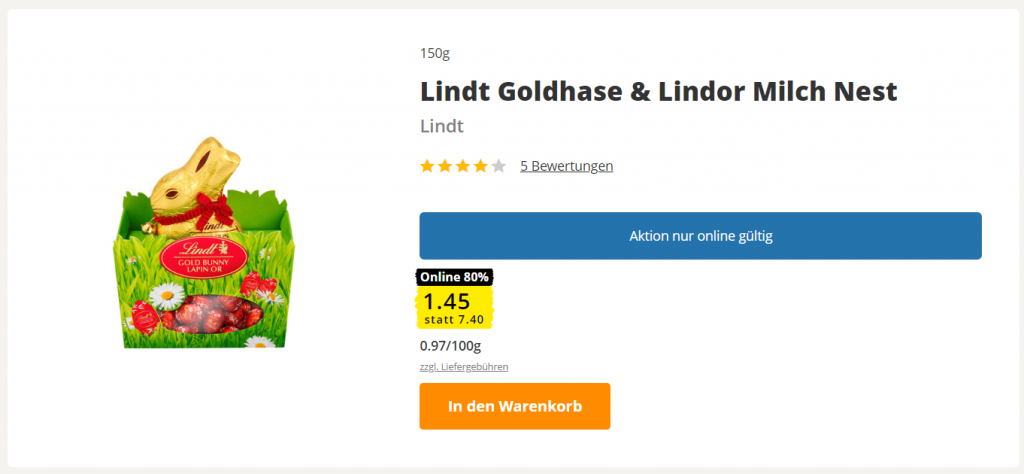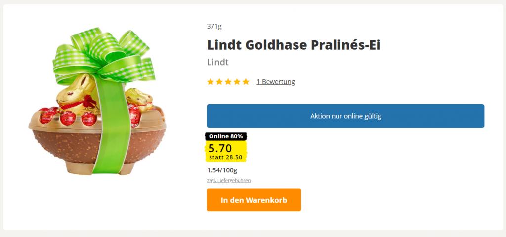 80% Rabatt auf Osterschoggi bei coop.ch z.B. Lindt Schoggi für CHF 0.97 für 100g, Halba für CHF 0.60 für 100g