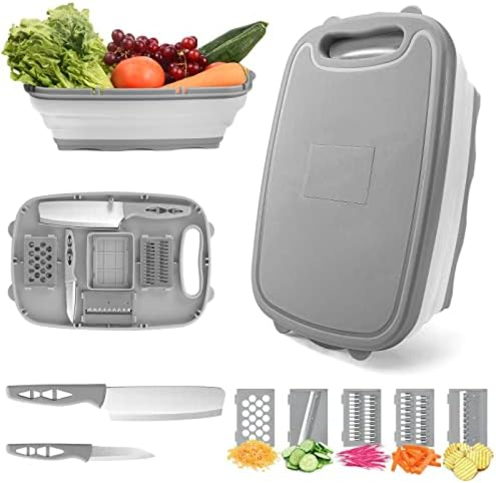 - 9-in-1 multifunktionales Schneidebrett-Set mit 5 Gemüseschneidern, 2 Messern und Abtropfkorb