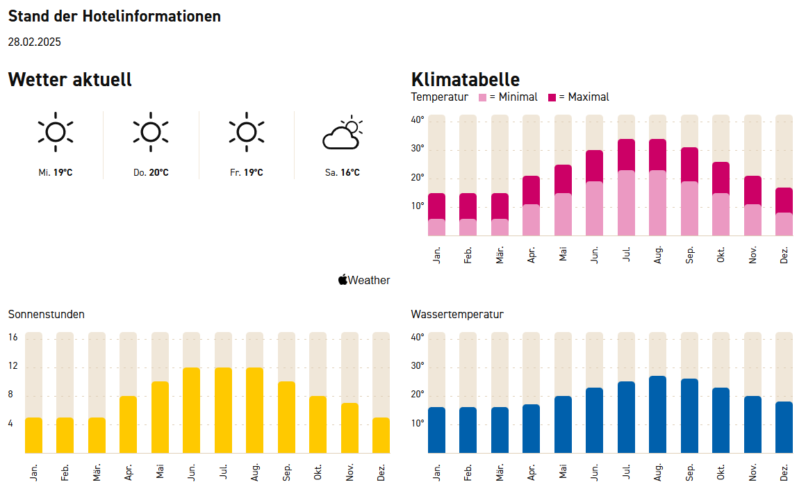 Will hier nicht den Pedanten spielen. Aber aus irgendeinem Grund gibt es für Februar in der KLIMA-Tabelle einen Bereich von 5-15 °C. Das kann natürlich bei einer Momentaufnahme vom Wetter schöne 15 °C und Sonnenschein bedeuten, aber halt auch mal 5 °C, Nieselwetter, keine Ahnung was...