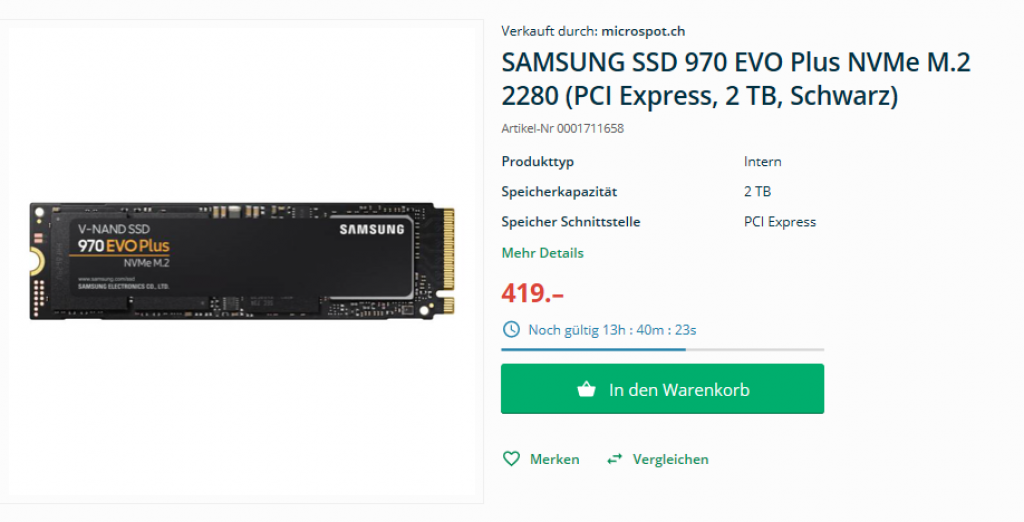 bei Microspot gibt es die Samsung 970 EVO Plus 2TB zum unschlagbaren Preis von CHF 419.- im Happy Day. zweitbester Preis auf toppreise ist CHF 463.90.