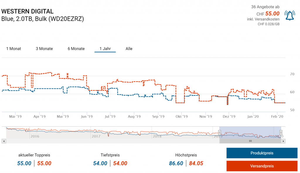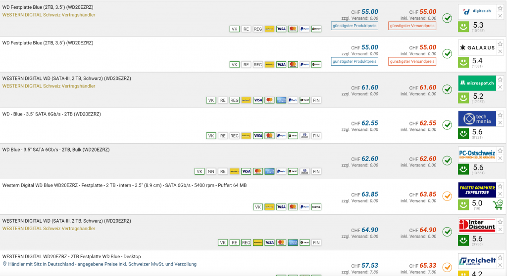 Bei digitec gibt’s die WD Blue 2TB Harddisk gerade für CHF 55.- Bestpreis war CHF 54.- Derzeit zweitbester Preis beträgt CHF 61.60
