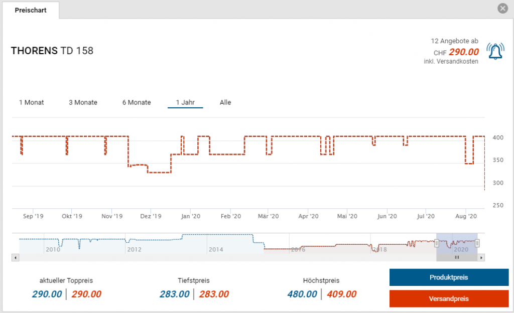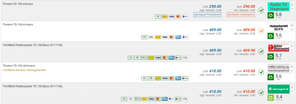 Bei Radio-TV-Hagmann gibt es den THORENS TD 158 Plattenspieler für den neuen Bestpreis von CHF 290.-. Der vorherige Bestpreis war CHF 329.-. Der zweitbeste Preis beträgt CHF 409.-.
