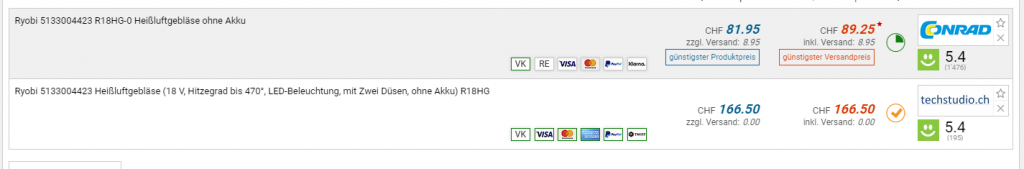 Bei Conrad gibt es die RYOBI ONE+ Akku-Heißluftpistole zum neuen Bestpreis von CHF 89.25. Der vorherige Bestpreis war CHF 111.80. Der zweitbeste Preis beträgt CHF 166.50.