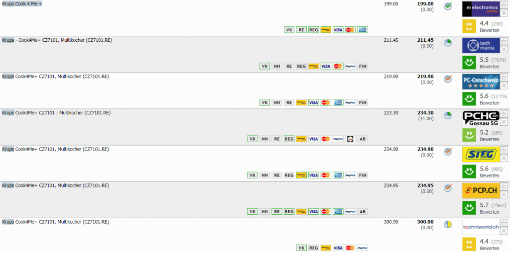 Auch den Krups Cook 4 Me + gibt’s bei melectronics mit den Gutscheincodes (weiter unten) zum Best Price von CHF 169.10. Der zweitbeste Preis in der Schweiz beträgt CHF 211.45. Leider gibt’s auf toppreise keinen Preisverlauf zum Cook 4 Me +