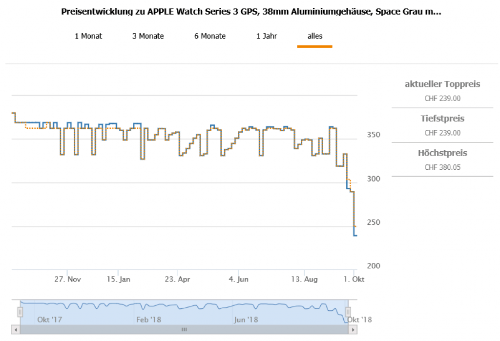 Gemäss toppreise gab es die Watch in der Ausführung bislang nie günstiger als für 289.40 CHF, was aktuell auch der zweitbeste Preis ist.
