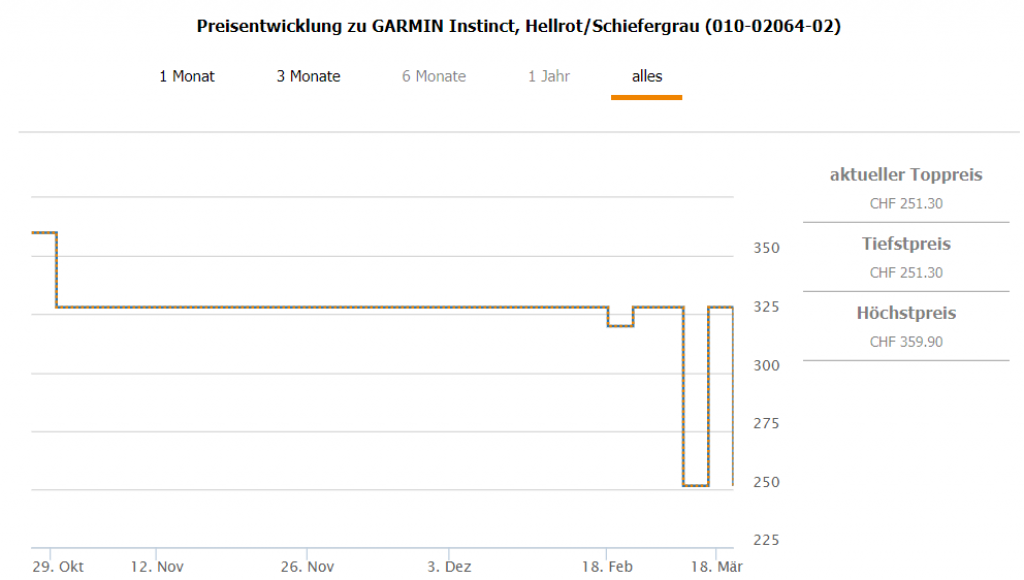 Zweitbester Preis beträgt CHF 327.90 Bestpreis war schon einmal die CHF 251, günstiger gab es die Uhr laut toppreise noch nie.