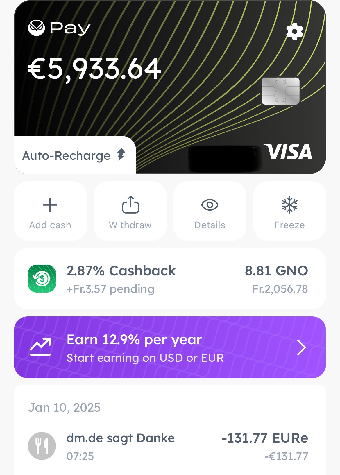 Mal ehrlich, was ist der wirkliche Vorteil von dem zu crypto.com? Ok, bei crypto.com sind die Cryptos auf der Exchange. Aber für den Durchschnittsuser ist crypto.com massiv einfacher zu verstehen. Cashback gibts bei der Royal Indigo ebenfalls 3.5% im ersten Jahr, danach 3%. Ausserdem ein halbes Jahr lang monatlich je ca. 13.- Cashback an Spotify und Netflix. Zudem gratis Lounge Zugang an den Flughafen. Und eine sehr wertige Metallkarte (ja, wirklich metall!) die Apple Pay schon unterstützt. Gnosis scheint schon nicht schlecht zu sein - aber sorry, m M. für den Durchschnittsuser zu kompliziert. Und wenn du dir mal die Roadmap von crypto.com anschaust mit Multicurrency Account, Stock Zugang, etc. etc. dann kommt CDC vermutlich näher an Revolut ran als Gnosis Pay.