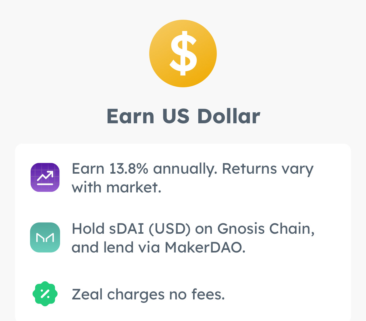 - deponiert sDAI (USF stablecoin) in Zealwallet und leiht es via MakerDAO für 13.8% jährlich