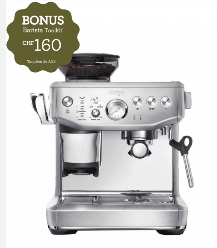 Zusätzlich GRATIS Barista Toolkit von Sage. Beim kauf dieser Maschine bis 09.01.2024 und Registrierung bei Sage: https://www.sageappliances.com/ch/de/promotions/bonus-gift-pack-2023.html