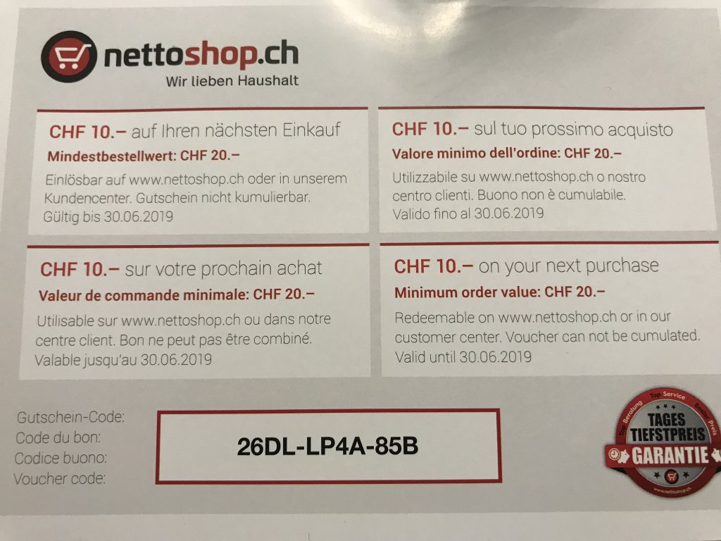 CHF 10.- auf den nächsten Einkauf mit Gutscheincode: 26DL-LP4A-85B Der Code sieht zwar personalisiert aus, ich konnte ihn aber bereits mehrmals einlösen. Mindestbestellwert ist NUR CHF 20.-.