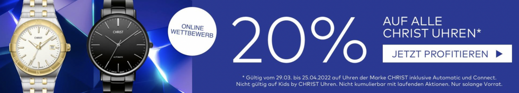 Bei CHRIST gibt es bis zum 25.04. mindestens 20% Rabatt auf alle Uhren der Eigenmarke.