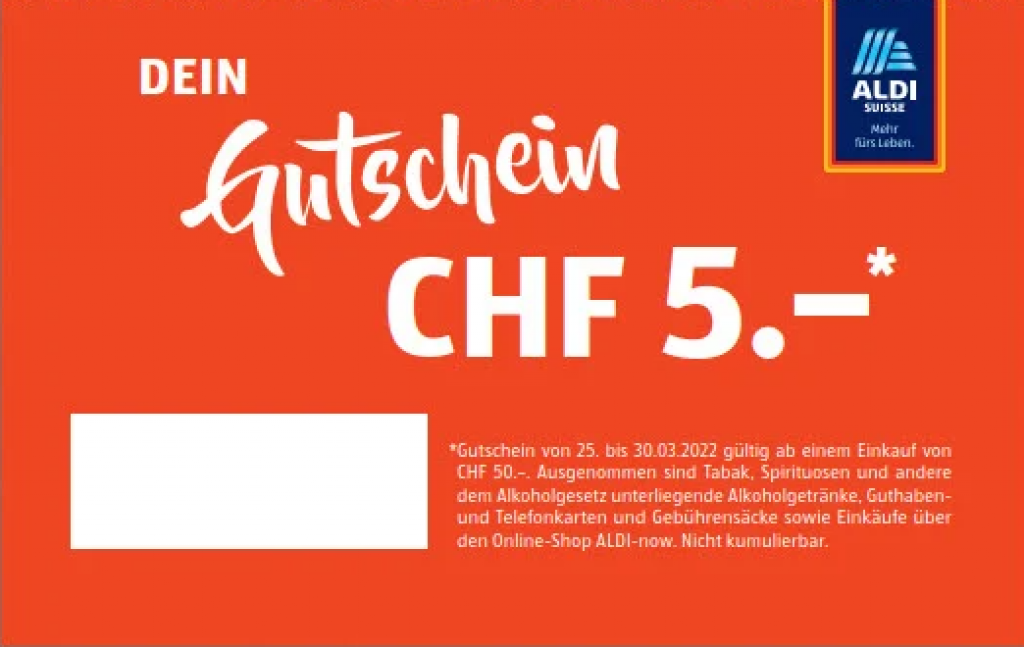 Vom 25. bis 30.3.2022 gibt es bei Aldi Schweiz mit diesem Bon einen Rabatt von CHF 5.- ab einem Warenwert von CHF 50.- (in den Filialen und Online).