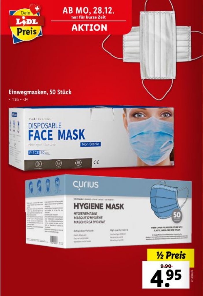 Bei LIDL gibt’s ab Montag, 28. Dezember 50 Einweg-Masken für CHF 4.95