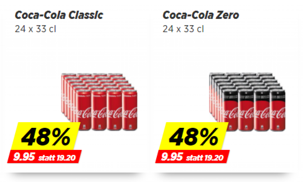Ab Dienstag 13. Oktober 2020 gibt es bei Denner Coca-Cola Classic Dosen 24 x 33cl für CHF 9.95 statt CHF 19.20 (48% Rabatt). Dies ergibt einen Preis von 41 Rappen pro Dose!