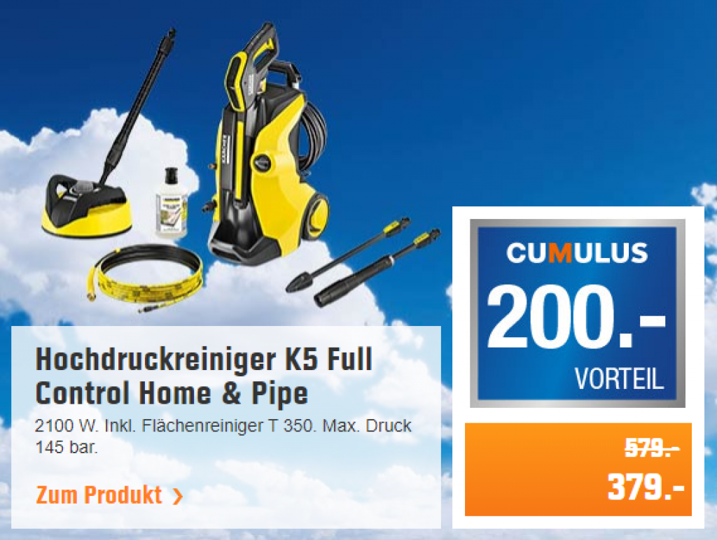 Beim Baumarkt Obi gibts derzeit den Hochdruckreiniger Kärcher K5 im Full Control Home Kit mit einem Zusatzschlauch zum Aktionspreis von 379 Franken. Ein Vergleich erweist sich als relativ schwierig, da die Bezeichnungen und das Zubehör teils stark unterscheiden. Laut Recherche soll aber das günstigste Angebot mit allem ausser dem Schlauch bei 460 Franken liegen.