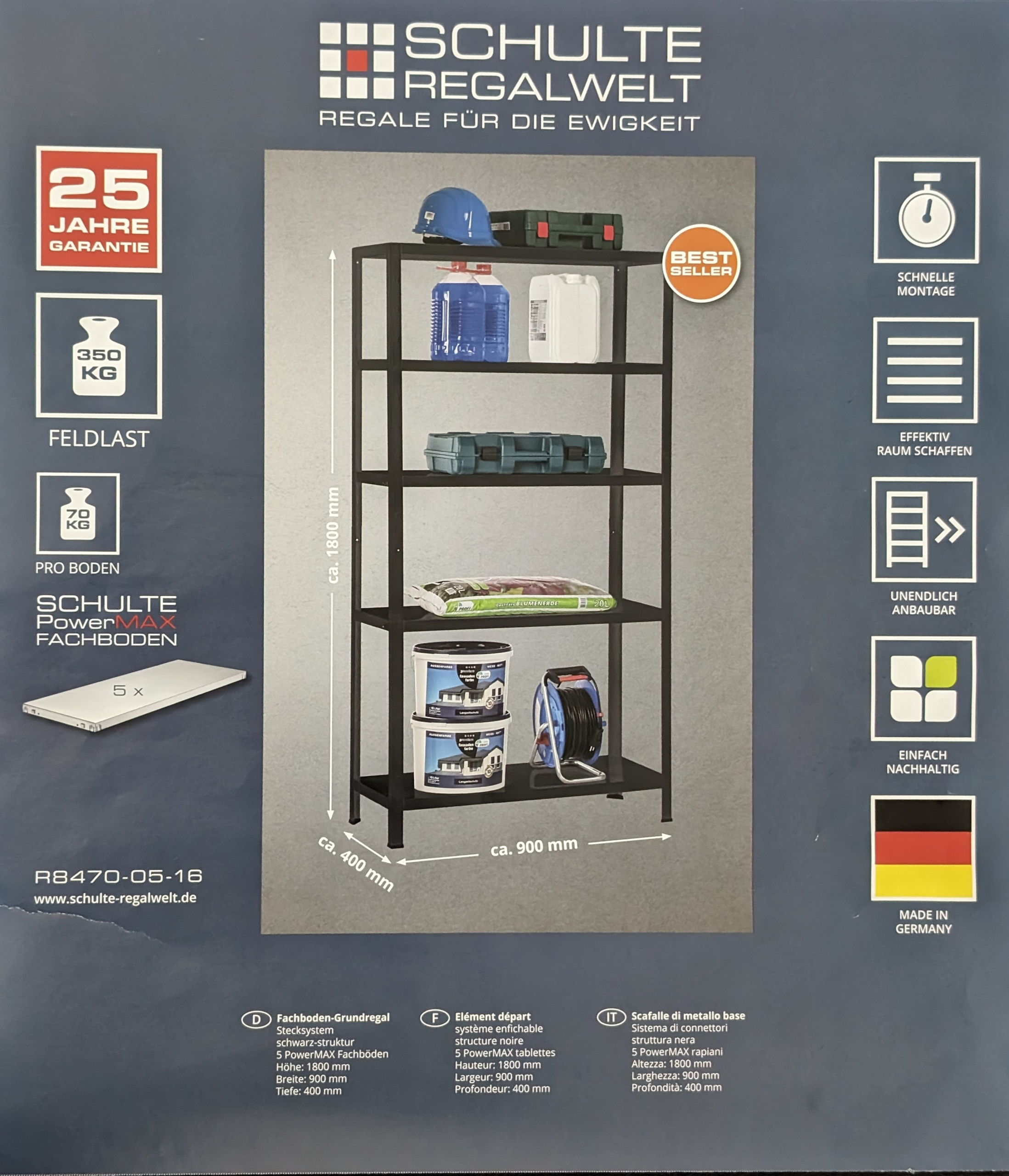 Dieses Grundregal besteht aus nachhaltigem Material und verfügt über fünf PowerMAX-Fachböden, die für eine besondere Stabilität sorgen. Der Aufbau des Regals erfolgt dank des Stecksystems schnell und unkompliziert: Es wird einfach gesteckt, ohne zu verschrauben. Für verpackte Haushaltswaren und Lebensmittel geeignet.