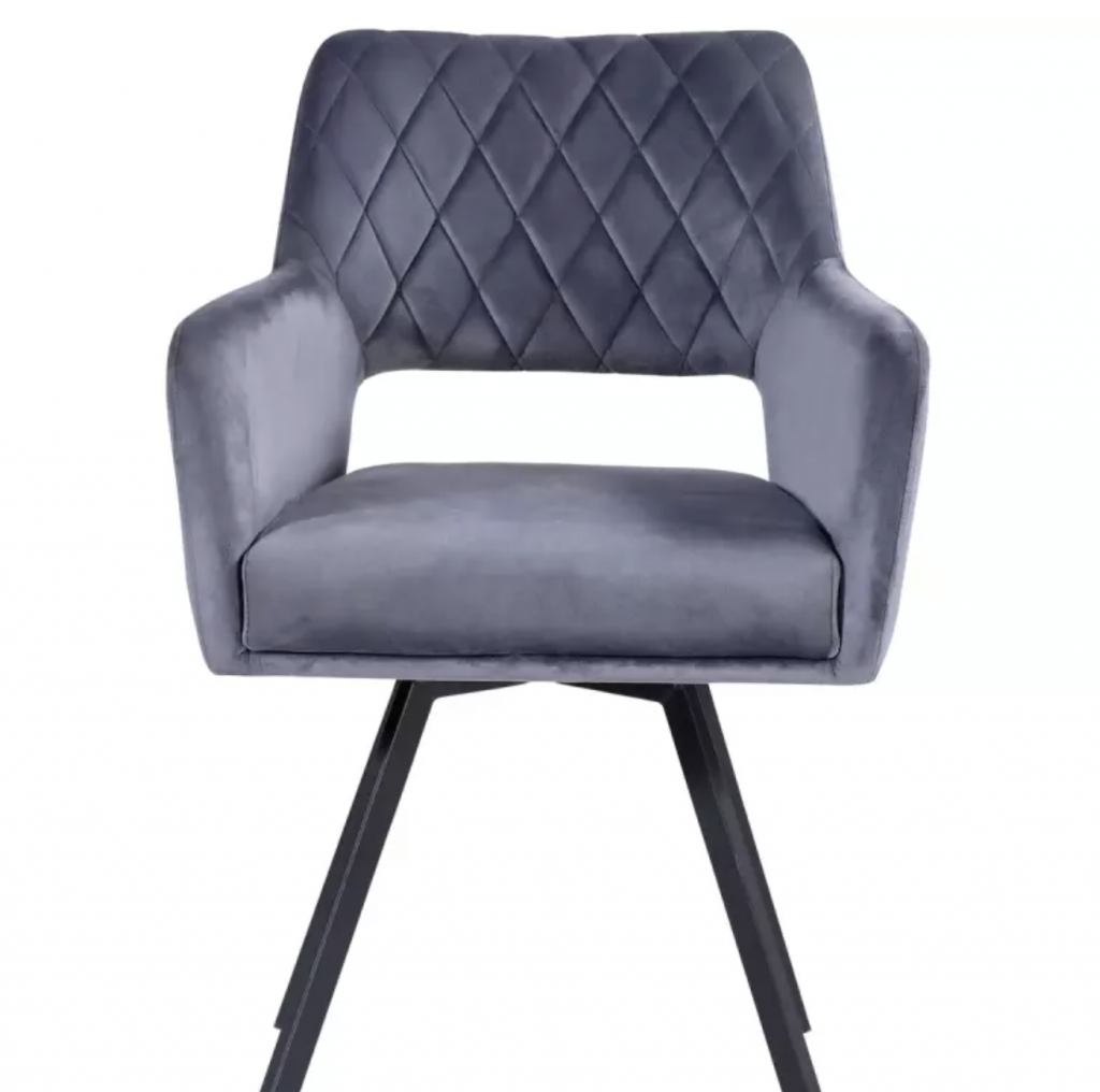 Der Vierfussstuhl VICKY kombiniert moderne ästhetik mitrobusten Materialien und einem entspannenden Sitzerlebnis. Auf dem gepolsterten Sitz können Sie es sich so richtiggemütlich machen. Der schöne samtene Polyester-Webstoff in schickem Grau kommt durch das karierte Muster und dem stylischen Ausschnitt an der Rückenlehne besonders gut zur Geltung und fühlt sich dabei angenehm geschmeidig an. Für den besonderen Komfort sorgen Rückenlehne, Armlehnen und eine optimale Taschenfederkern- und Schaumstoff-Polsterung.Ergänzt wird das stilvoll abgerundete Design des Sitzes mit einem robusten Vierfuss-Gestell aus pulverbeschichtetem Eisen in Schwarz. Ob Esstisch, Schreibtisch oder Wohlfühl-Oase, dieser Stuhl macht überall eine gute Figur.