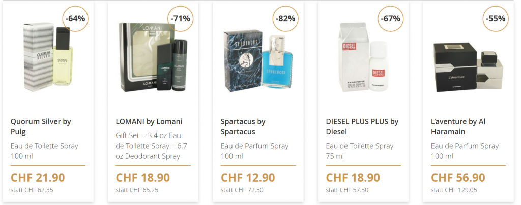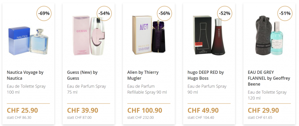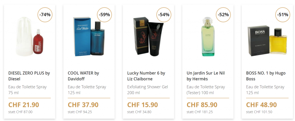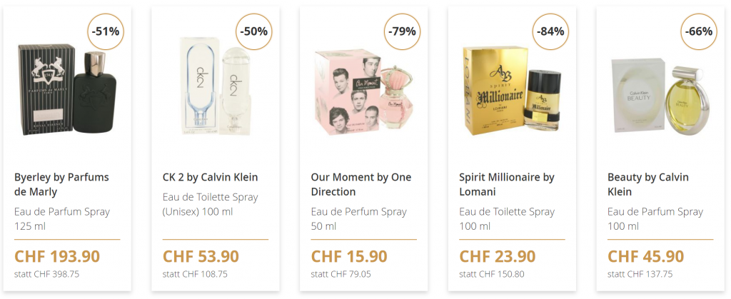 Bei ParfumSALE findet gerade ein Abverkauf statt. Der Preisvergleich bei Parfums in der Schweiz ist relativ schwierig, da kaum Preisverläufe zu finden sind. Ich habe jedoch verschiedenste Parfums im Preis verglichen und ParfumSALE war bei allen Produkten im Abverkauf der günstigste Anbieter. Meistens ca. 5 Rappen teurer: Parfum-Factory. Alle anderen Händler sind in den meisten Fällen mehrere Franken teurer.