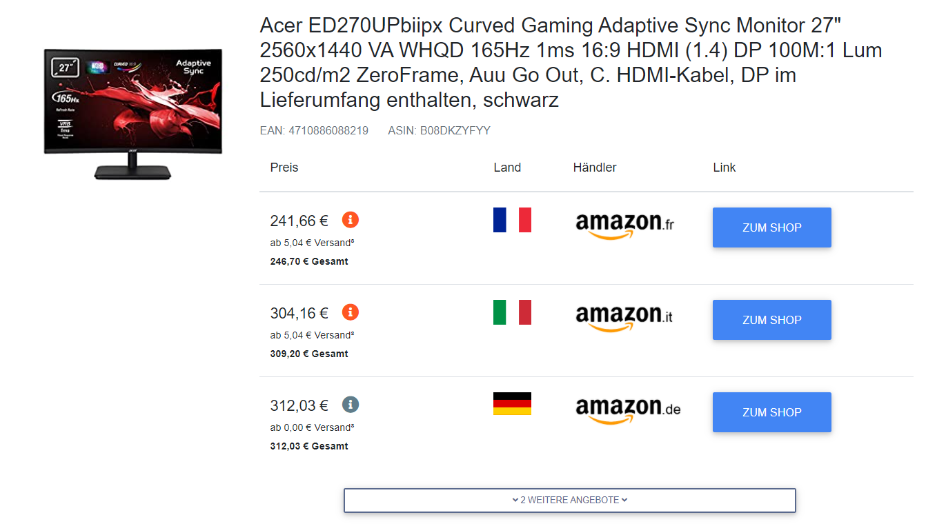 Bei Amazon Frankreich gibts derzeit den Gaming-Monitor Acer ED270UPbiipx zum super Preis von 242 Franken. Bei toppreise ist dieses Modell zwar nicht gelistet, das erst kürzlich hier auf Preispirat gepostete Angebot von digitec ist diesem Modell aber sehr ähnlich.