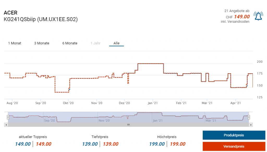 Bei microspot gibts derzeit den Gaming-Monitor ACER KG241QSbiip (UM.UX1EE.S02) zum Aktionspreis von 149 Franken. Laut toppreise lag der bisherige Bestpreis bei nahen 139 Franken, sonst kostet er ab ca. 178 Franken beim zweitgünstigsten Anbieter.