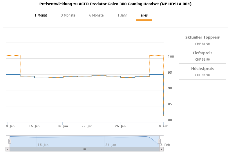Gemäss toppreise war der bestprice bislang bei 93.80 CHF, der zweitbeste Preis liegt aktuell bei 100.90 CHF.