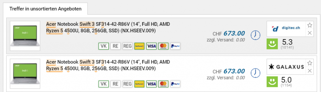 Bei Amazon kann man sich derzeit das Ultrabook Acer Swift 3 mit Ryzen 5 4500U CPU, 8GB RAM und 256 GB SSD zum Aktionspreis von 585 Franken in die Schweiz bestellen. Laut toppreise liegt der Vergleichspreis bei 673 Franken (noch dazu mit langer Lieferzeit).