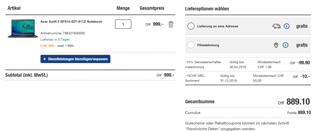 • Melectronics Newsletter abonnieren. Darin erhält man einen 10 Franken Gutschein – kann auf eine Wegwerfmailadresse gemacht werden.