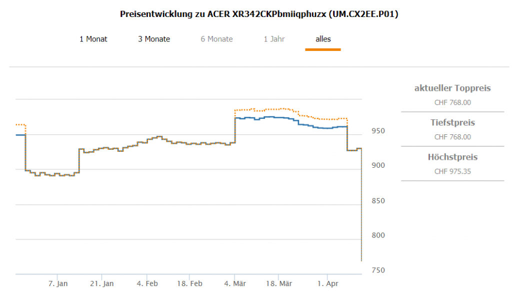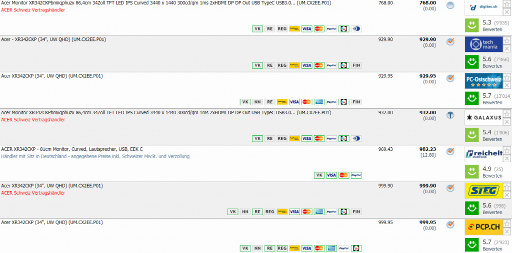 Bei digitec gibt’s den 34“ LCD Curved PC-Monitor ACER XR342CKPbmiiqphuzx für CHF 768.- Zweitbester Preis in der Schweiz beträgt CHF 929.90 Bestpreis war bei CHF 891.-