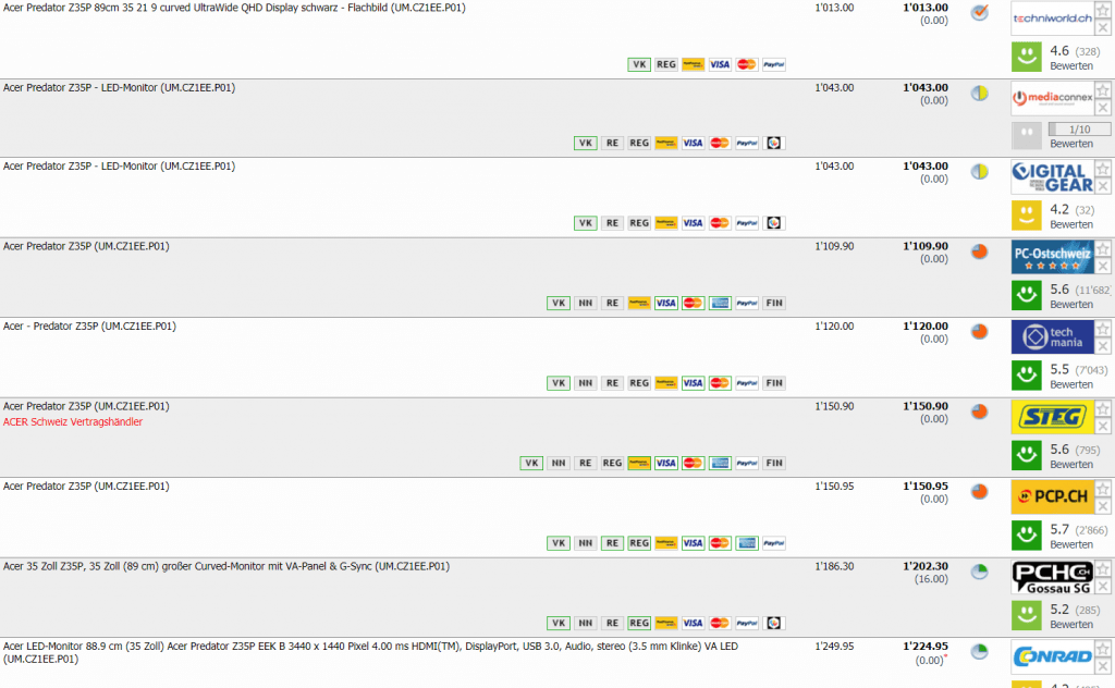 Bei digitec gibt’s den Acer Z35P Gaming-Monitor mit einer Bildschirmdiagonale von 35“ gerade sehr günstig zu haben: CHF 799.- kostet das gute Stück. Bislang gab’s den Monitor laut toppreise nie unter CHF 911.- momentan ist der zweitbeste Preis bei CHF 1’013.-