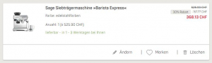 Der Rabattcode funktioniert auch u.a. mit den Barista Siebträger-/ Kaffeemaschinen von Sage. So zahlt man z.B. für die Sage „Barista Express“ nur noch CHF 368.- (Toppreise aktuell ab CHF 449.-):