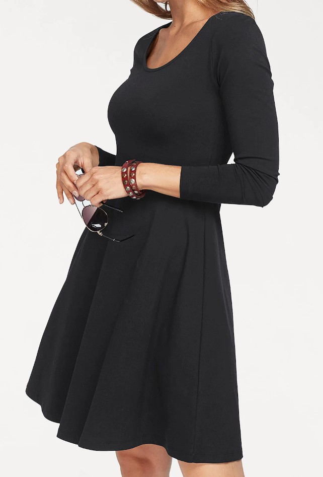 Figurbetontes Damenkleid von Aniston Casual. Weiter Rundhalsausschnitt, lange Ärmel. In kniefreier Länge mit weit schwingendem Rockteil. Feminin mit Ballerinas, sportiv mit Sneakers. Elastische Jerseyqualität.