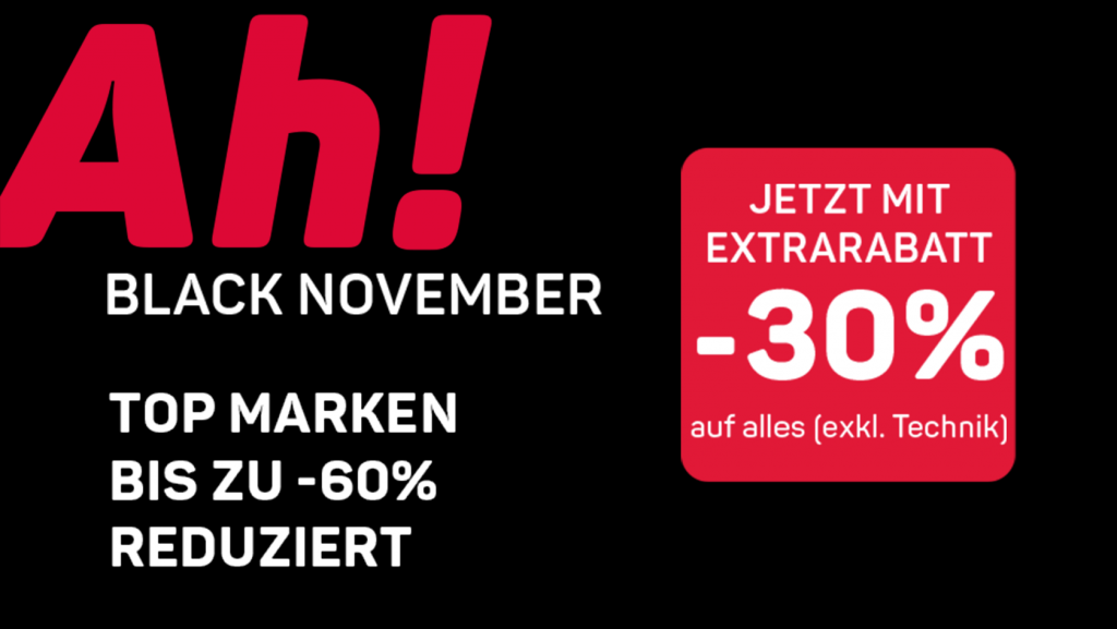 BLACK NOVEMBER bei Ackermann: Von 21.11 - 28.11 gibt es -30% Rabatt auf alles (exkl. Technik). Jetzt Black November Deals entdecken und Angebote zu unschlagbaren Preisen sichern.