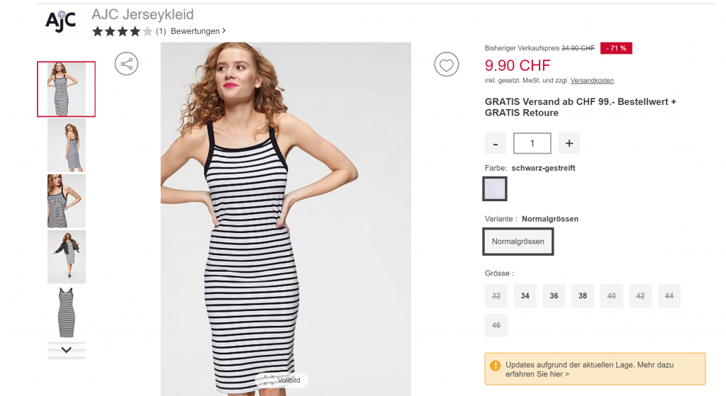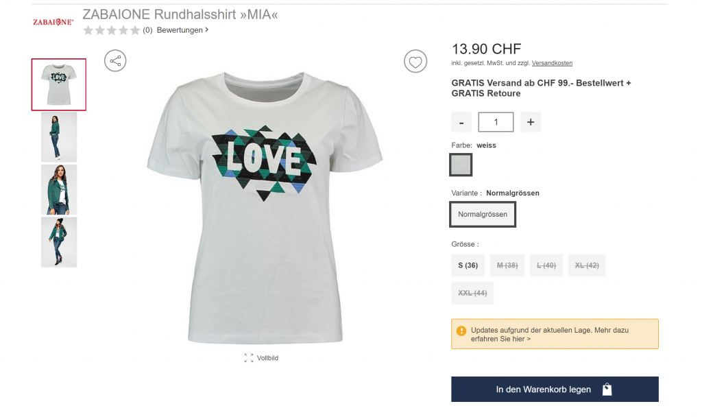 Leider scheint der Rabatt nur auf Artikel für Damen anwendbar zu sein. Ein Versuch mit einem Herren T-Shirt hat nicht geklappt. Die 50% werden auch auf bereits reduzierte Preise abgezogen d.h. es gibt noch bessere Deals. Der Versand ist ab CHF 99.- Bestellwert gratis.