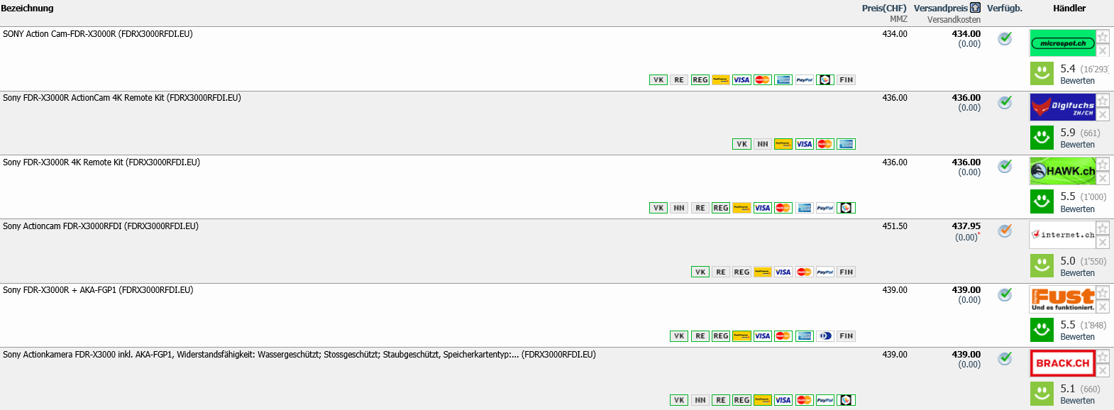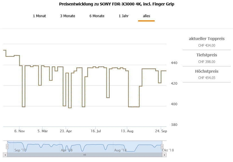 Gemäss toppreise gab es die Kamera bislang nie günstiger als für 398.- CHF, der zweitbeste Preis liegt aktuell bei 434.- CHF.