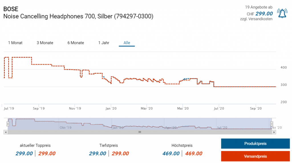 Bei Amazon gibts derzeit die Over-Ear ANC-Kopfhörer 700 von Bose zum Aktionspreis von 249 Franken. Laut Preispirat-Recherche gabs die beliebten Reise-Kopfhörer bereits einmal zum ähnlichen Preis von 247 Franken, ebenfalls bei Amazon. Falls ihr euch fürs schwarze Modell entscheiden sollt, zahlt ihr einen kleinen Aufpreis von 10 Franken.