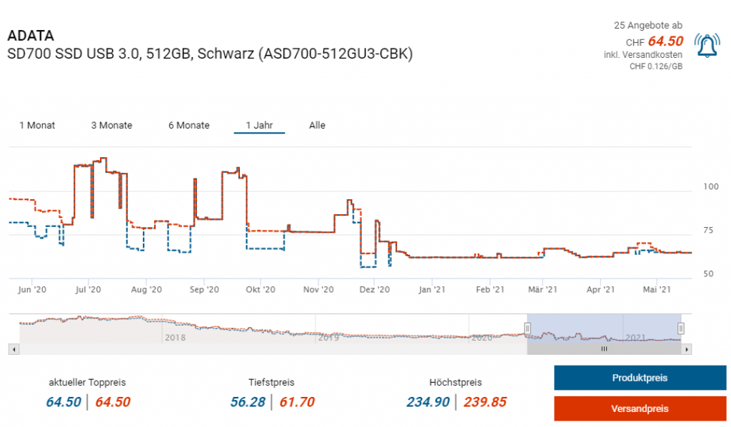 Bei Daydeal gibts heute die externe SSD Adata Flash SD700 mit einer Speicherkapazität von 512GB zum Aktionspreis von 49 Franken. Laut toppreise starten die Vergleichspreise sonst bei CHF 64.50.