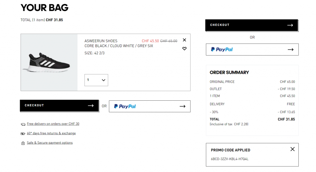 Bei Adidas gibt’s den ASWEERUN in der Farbe schwarz in den Grössen 39 1/3 bis 48 für nur CHF 31.85, wen man den personalisierten Preispirat-Gutschein einsetzt.