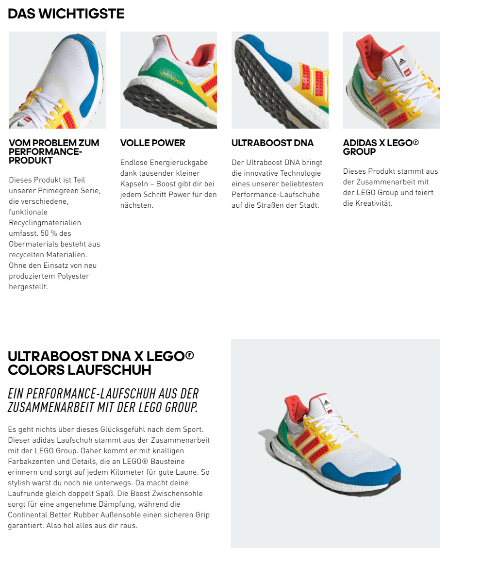 Bei Adidas könnt ihr euch jetzt die beliebten Lego-Schuhe Adidas UltraBoost DNA X LEGO zum Aktionspreis von 154 Franken sichern! Um vom Dealpreis profitieren zu können, müsst ihr lediglich einen Gutscheincode mit dem Generator hier unten generieren und ihn einsetzen. Zum Zeitpunkt der Dealerstellung könnt ihr noch die Grössen zwischen 39 1/3 und 50 2/3 auswählen.