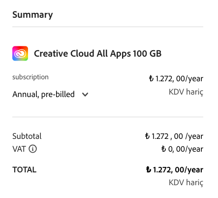 Bei Adobe Türkei gibt es aktuell einen Black Friday Deal für Adobe Creative Cloud: ihr bezahlt für 1 Jahr CHF 108.- (TL 2251) und danach CHF 190.- (TL 3766) pro Jahr.