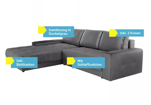 Bei LIPO gibt es das Adria Ecksofa mit Schlaffunktion (213 x 308 cm) in 3 verschiedenen Farben inklusive Lieferung für den Preis von 919.15 Franken. Bei Abholung kostet es nur noch 789.- mit dem Rabattcode. Das Angebot gilt für 3 verschiedene Farben und ist gültig bis am 2.12.2024, solange der Vorrat reicht.