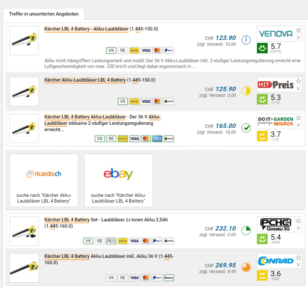 Bei Amazon kann man sich derzeit den Laubbläser von Kärcher, dem LBL 4 ohne Akku, zum Aktionspreis von knapp 40 Franken sichern. Um auf den Preis zu kommen, müsst ihr den Warenkorb auf mind. 39€ Bestellwert vor Abzug der Mwst füllen. Dies gelingt z.B. mit diesen Heftklammern von Stanley.
