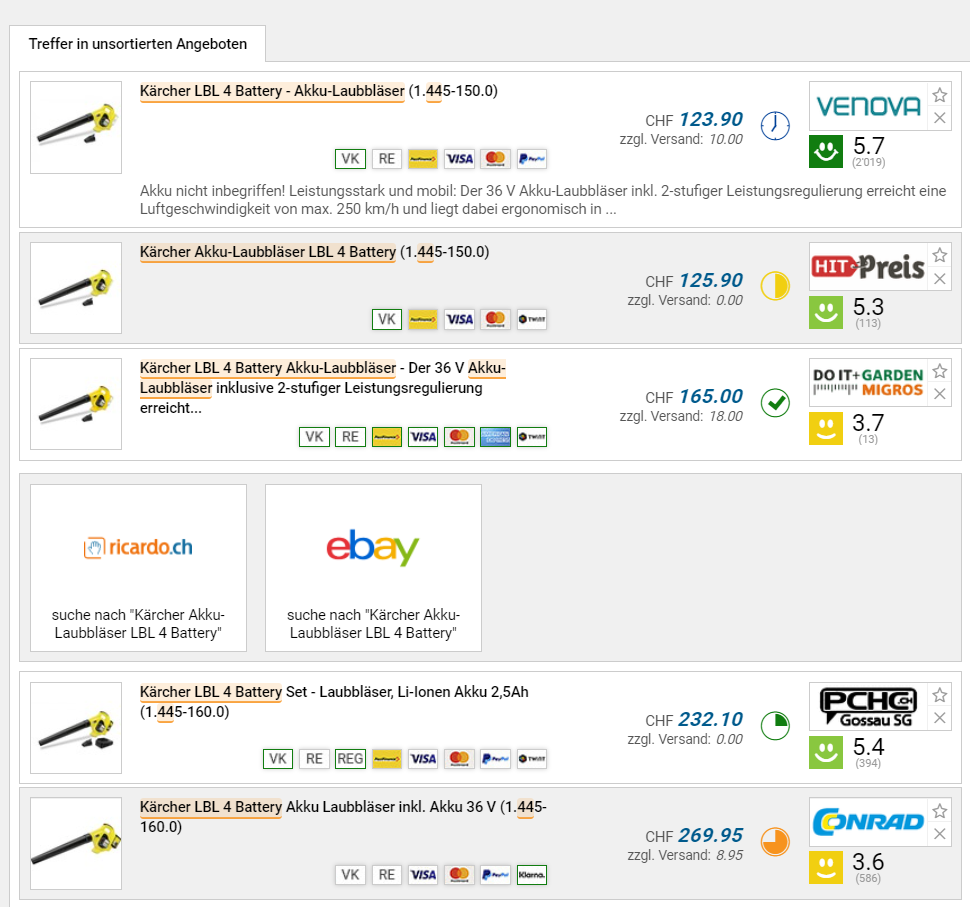 Bei Amazon kann man sich derzeit den Laubbläser von Kärcher, dem LBL 4 ohne Akku, zum Aktionspreis von knapp 40 Franken sichern. Um auf den Preis zu kommen, müsst ihr den Warenkorb auf mind. 39€ Bestellwert vor Abzug der Mwst füllen. Dies gelingt z.B. mit diesen Heftklammern von Stanley.
