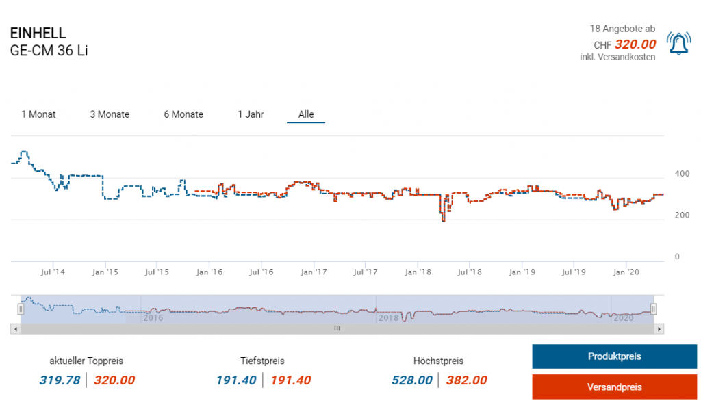 Der nächstgünstigste Anbieter ist derzeit galaxus, wo nur der Rasenmäher an sich 320 Franken kostet, diesen gab es aber alleine schon mal für weniger, nämlich CHF 191.40 laut toppreise.