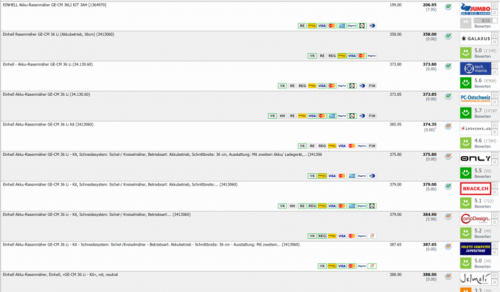 Bei Jumbo gibt’s gerade den Akku-Rasenmäher Einhell GE-CM 36 Li mit 2 Akkus für CHF 199.- Die Lieferung kostet zusätzlich vernünftige CHF 7.95 Zudem gibt’s 5 Jahre Garantie.