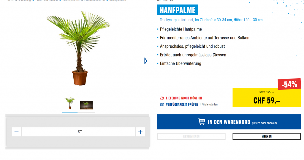 Zudem vielleicht auch noch interessant: Es gibt auch eine Hanfpalme (Trachycarpus fortunei) für 59 Franken. Hier ist aber nur Filiallieferung oder Abholung möglich. Versand nach Hause geht nicht.