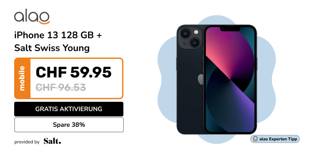Aktuell sparen unter 30-Jährige bei Alao fast 40%, wenn man das iPhone 13 128 GB zusammen mit Salt Swiss Young abschliesst. Das Angebot CHF 59.95 anstatt CHF 96.53 pro Monat kombiniert mit dem CHF 35.- Cashback Gutscheincode „alaoPP4“ ergibt CHF 58.49 monatlich. Die Leistungen beinhalten: