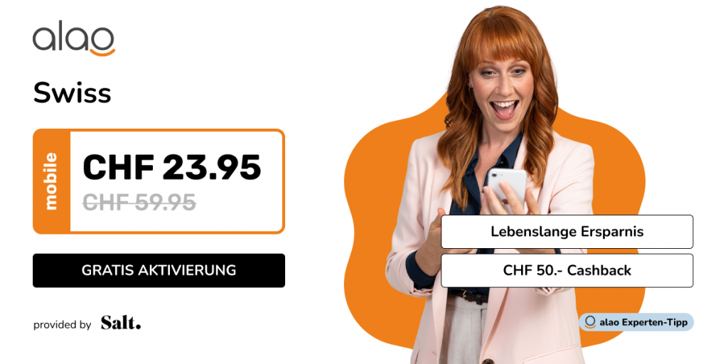 Bei Alao gibt es zurzeit das Salt Swiss Abo für CHF 20.41 / Mt. Das Angebot von CHF 23.95/Mt. kombiniert mit dem CHF 50.- Cashback sowie dem Gutschein für Salt-Bestellungen ergibt einen lebenslangen Rabatt von über 65% Rabatt. Die Leistungen von Salt Swiss beinhalten: