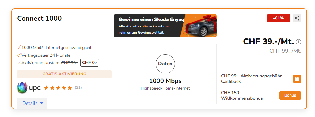 Bei alao gibt’s wieder einmal das UPC Connect 1000 Internet-Abo für zuhause zum sehr günstigen Preis von unter 31 Franken pro Monat! Der Preis setzt sich folgendermassen zusammen: