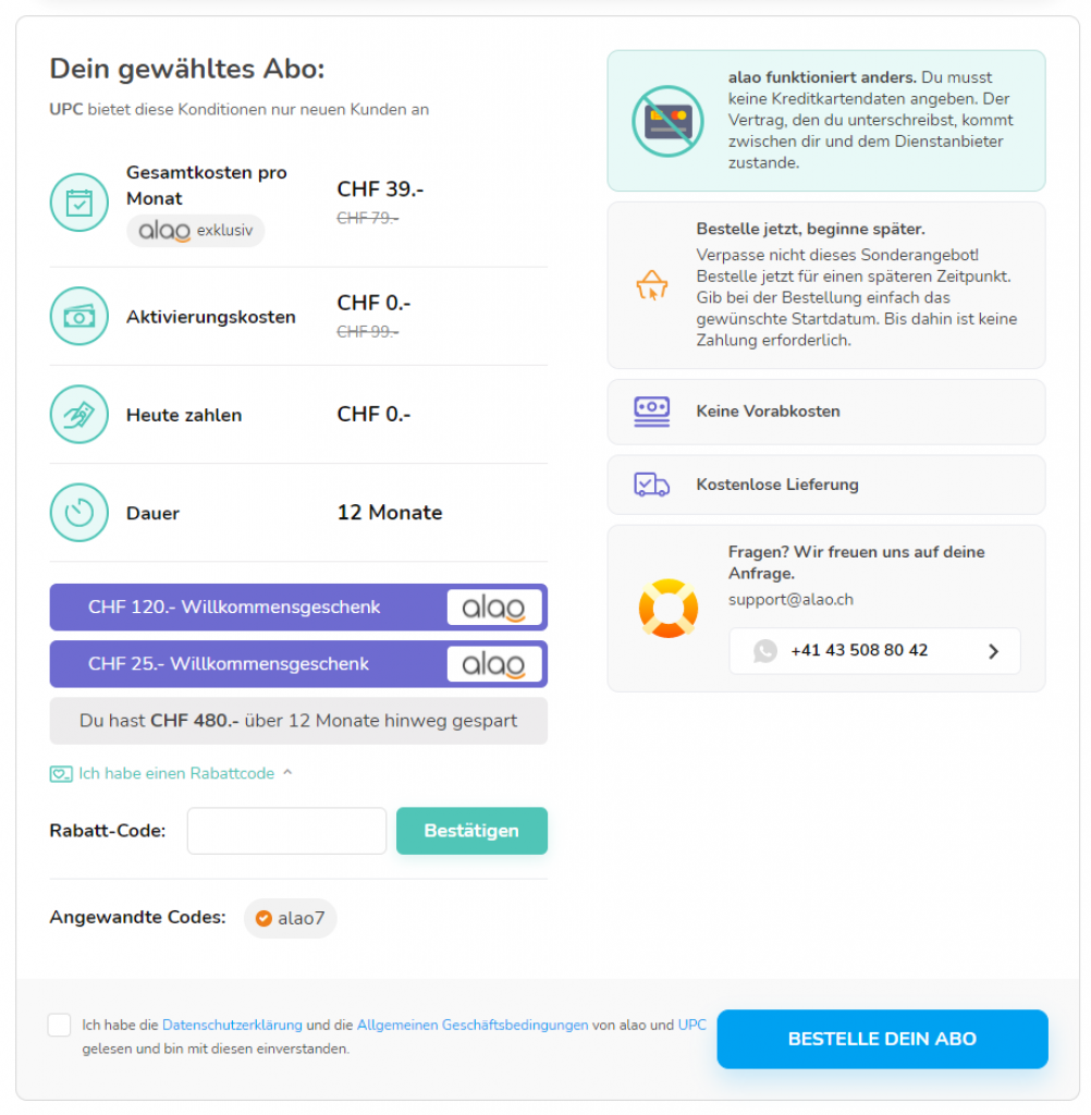 Aktuell gibt es einmal mehr ein tolles Angebot bei Alao. So kostet das UPC Connect 600 bei Alao nur CHF 26.90, sofern man den Cashback von CHF 120.- sowie den Gutschein von CHF 25.- mit dem Code „alao7“ kombiniert. Für diesen Preis erhält man eine 600 Mbit/s Geschwindigkeit (was 75 MB/s entspricht und definitiv für die meisten ausreicht). Das Angebot gilt für 12 Monate, die Aktivierungskosten von CHF 99.- entfallen ebenfalls über Alao.